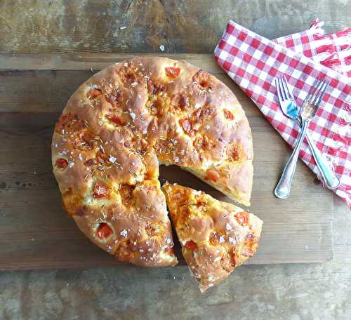 Made with spelt flour and Monterey Pepper Jack cheese, this spelt focaccia bread recipe is studded with tomatoes and flavoured with rosemary.