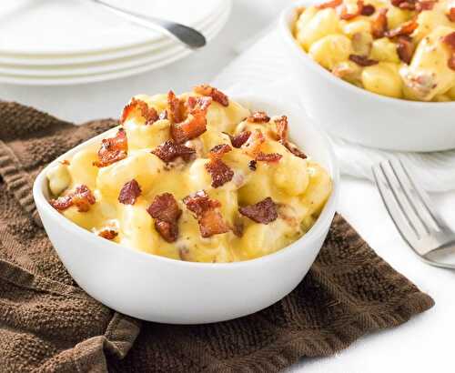 Gnocchi Mac and Cheese with Bacon is quite possibly the ultimate comfort food! Pillowy gnocchi swim in a luxurious cheese sauce infused by the smoky flavor of crumbled bacon!