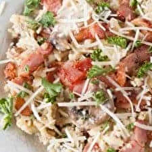 Italian orzo bacon mushroom bake is a delicious blend of an italian cheese sauce, orzo, canadian bacon, bacon and mushrooms.