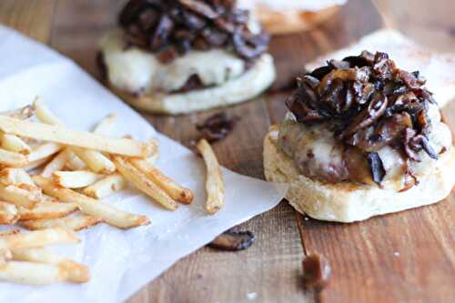 A Bacon Mushroom Swiss Burger recipe with juicy burgers, coated in melty swiss cheese, piled high with a super-simple bacon/mushroom/onion/beer reduction!