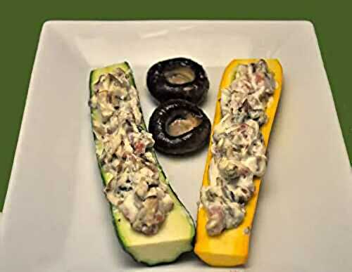 Mushroom & Bacon Stuffed Zucchini, with soft Goat Cheese and Garlic Mushroom Caps