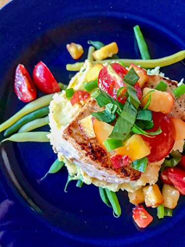 This summer swordfish recipe is both decadent and vibrant with a fresh summer salsa and rich scallion sour cream mashed potatoes.