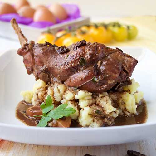 A braised rabbit covered with an unctuous chocolate sauce with a touch of wine served on a thick mashed potatoes bed.