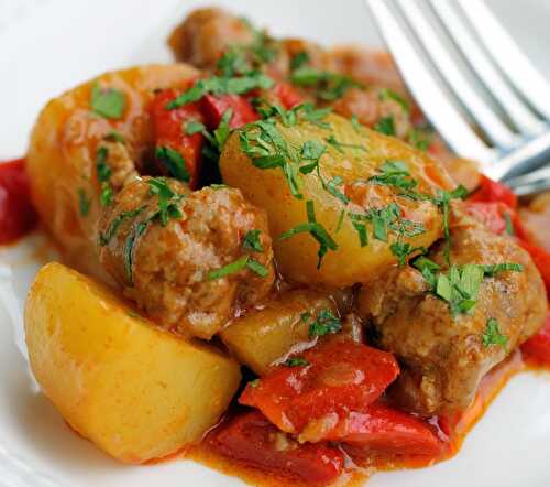This easy chorizo and potato Spanish tapas is topped with manchego cheese and roasted vegetables and is incredibly delicious!