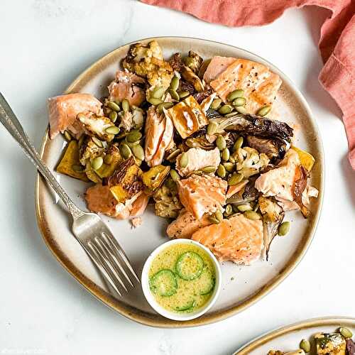 Roasted salmon and vegetables with citrus miso dressing is a fast and easy one pan dinner that everyone will love!