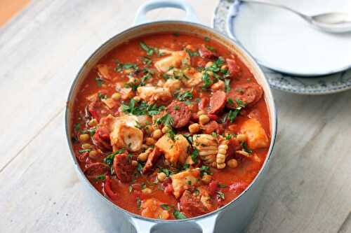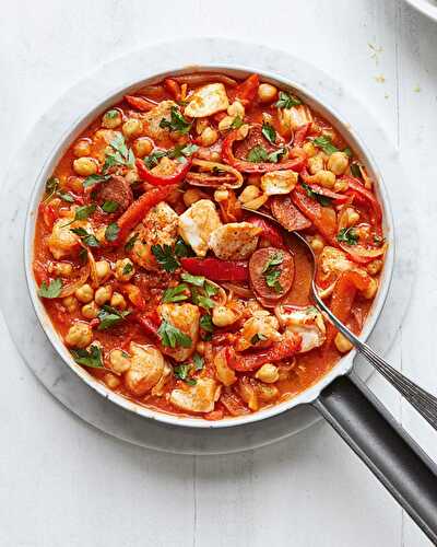 A spicy chickpea stew recipe served with fresh and zesty chermoula, and lemon baked cod - a perfect midweek meal bursting with Moroccan flavours!