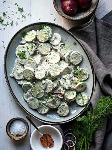 This creamy cucumber salad recipe with an easy dressing is full of healthy ingredients like Greek yogurt, miso paste, dill and olive oil.