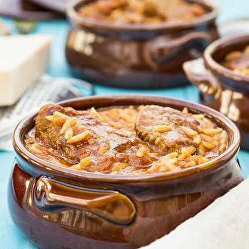 This hearty and flavorful Greek beef stew with orzo pasta, a.