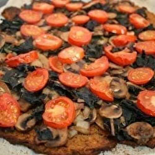 Healthy and delicious plant-based and flourless kale-mushroom pizza on cauliflower-chickpea base.