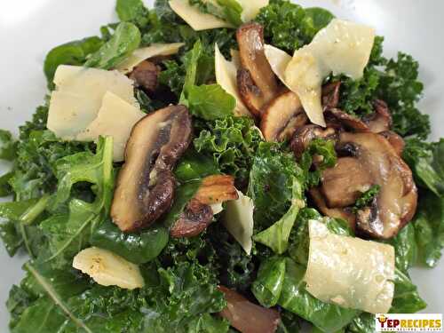 Kale and Arugula with warm mushrooms and shaved Parmesan tossed with a white balsamic vinaigrette.