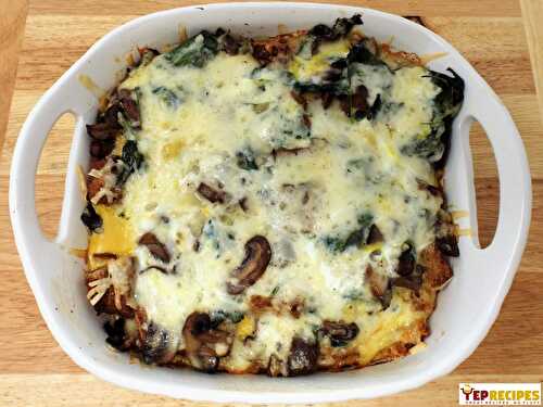 An easy overnight breakfast casserole with mushrooms, baby kale, Gruyere cheese, eggs, and whole grain bread.