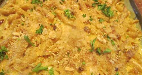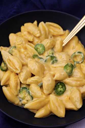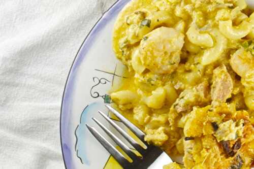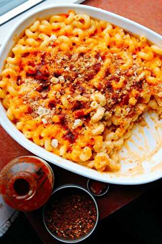Cream cheese makes this mac and cheese very creamy, dry mustard, a sprinkling of dried red pepper flakes, and beer add to the flavor.