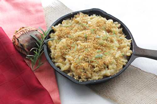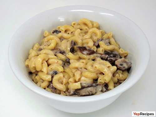 A stovetop mac & cheese with mixed mushrooms in a creamy white cheddar and gruyere cheese sauce.