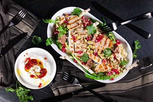 Grilled trout with a pomegranate and preserved lemon sauce all served over a bed of couscous.