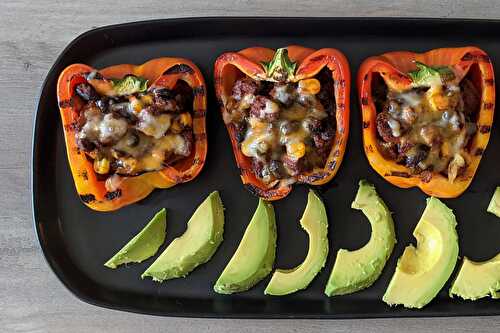 These grilled bell peppers stuffed with spicy chorizo, black beans, and veggies are a flavorful and healthy summer entrée.