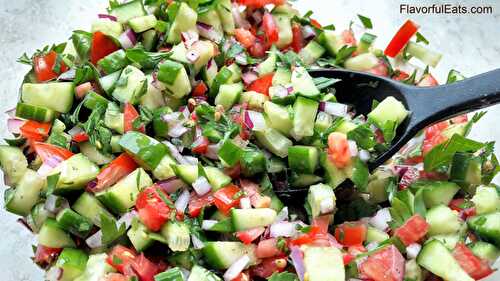Middle Eastern Salad Shirazi is a chopped salad made of tomato, cucumber, red onion, parsley, and lemon juice.