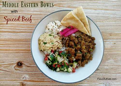 Middle Eastern Bowls with Spiced Beef have all your favorite Middle Eastern favorites like hummus, rice, salad shirazi, and ground beef seasoned with warm Middle Eastern spices all in one delectable bowl.