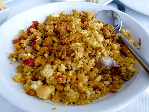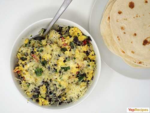 Easy vegetarian migas - a Tex Mex breakfast dish that's basically scrambled eggs with veggies and pieces of crispy tortilla.