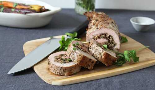 A roasted pork tenderloin stuffed with a mushroom, shallot, and garlic stuffing.