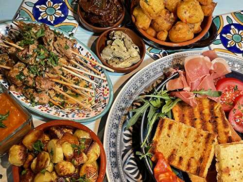 Here is a comprehensive recipe card with 4 gluten-free Spanish Tapas: Gluten-Free Chorizo Puffs, Patatas Bravas with authentic sauces, Pork Pinchitos and Gluten-Free Grilled Bread with garlic or fresh tomato topping.