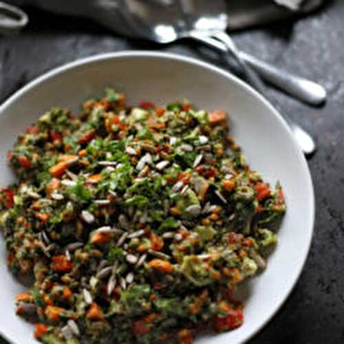 This spelt salad makes the perfect combination of the creamy spinach, avocado and tahini dressing and the crunchy carrot, spelt and bell pepper.