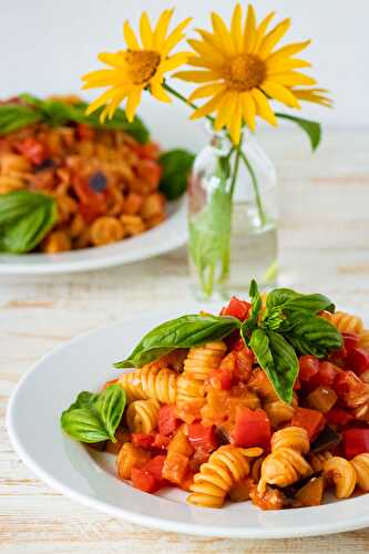 Delicious veggie loaded Sicilian pasta with eggplant, bell pepper, tomatoes and fresh basil.
