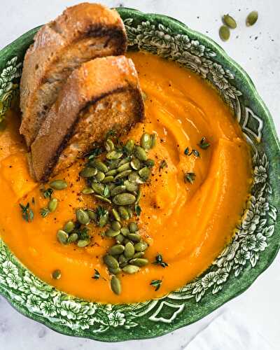 This delicious soup is made from roasted butternut squash, roasted tomato, and roasted garlic - blended together to create a silky smooth soup served with crusty sourdough, pumpkin seeds, and fresh thyme.