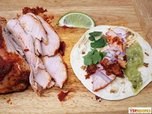 A Mexican dish consisting of pork marinated in dried chiles, pineapple and spices then roasted and served on tortillas.