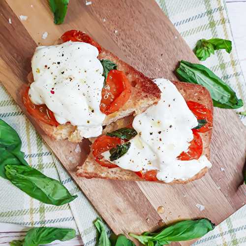 Toasted burschetta with garlic, slow-roasted tomatoes, burrata cheese and basil is a fresh and vibrant interpretation of the classic caprese salad.