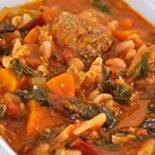 This is a delightful and hearty meatball soup that contains freshly homemade meatballs and freshly chopped vegetables, all simmered in a rich tomato broth.