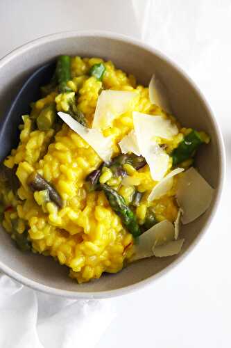 This Golden Saffron Risotto with Asparagus is delicate and aromatic, filled with spring veggies like green asparagus, sweet peas and a touch of parmesan.