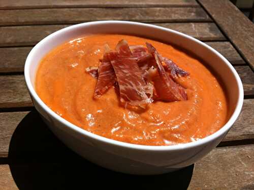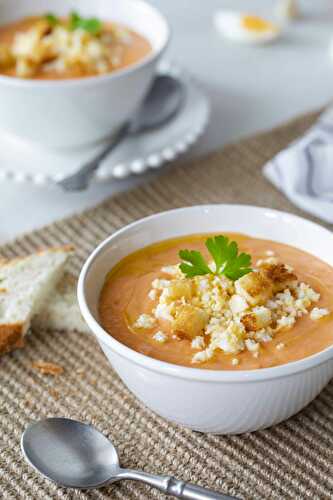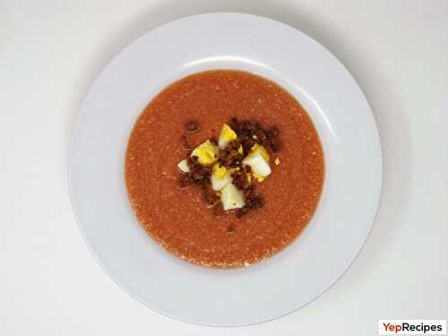 A Spanish pureed tomato soup served cold and topped with hard boiled egg and homemade Spanish style chorizo sausage.