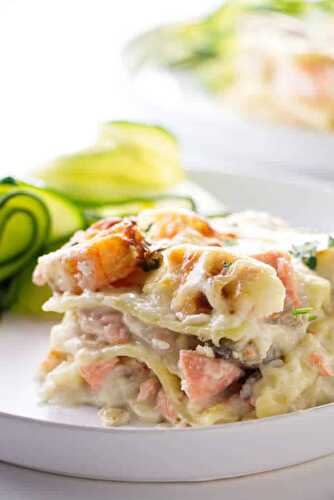 Seafood Lasagna filled with a delicious mix of shrimp, scallops, salmon and cod in a creamy béchamel sauce and baked in layers of wide lasagna noodles.