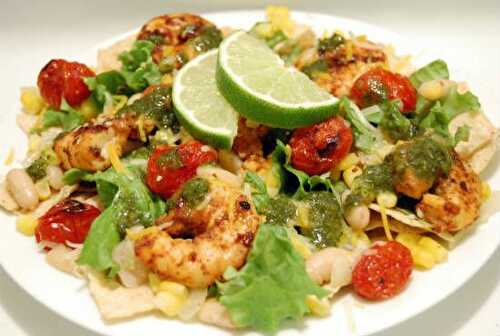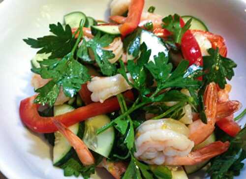 Shrimp goes with salad leaves, cherry tomatoes and more, to make this tasty low-calorie lunch or dinner.