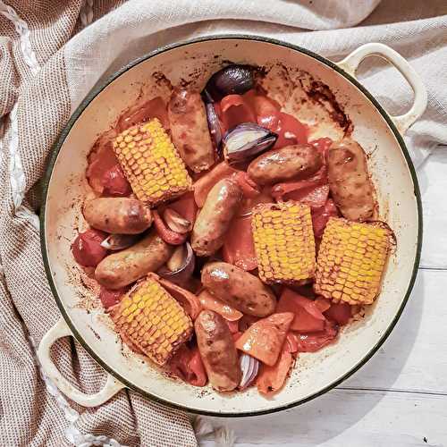A quick and easy sausage traybake recipe with spicy chipotle sauce - with lots of tomatoes, peppers, and corn on the cob!