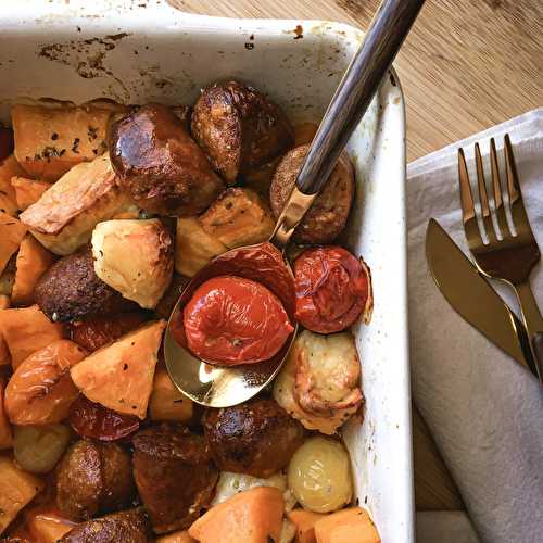An easy traybake recipe for every day with spicy sausage and halloumi - filled with flavours even the fussiest eater will love!