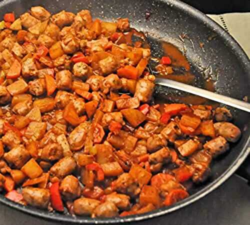 Spicy Sausage Hash, an easy skillet dinner with sausage, potatoes, onions, carrots, celery and red pepper.
