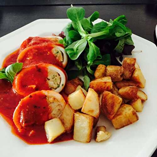 How does juicy shrimp and mushroom stuffed calamari recipe sound to you? The red pepper sauce served with it is the perfect accompaniment.