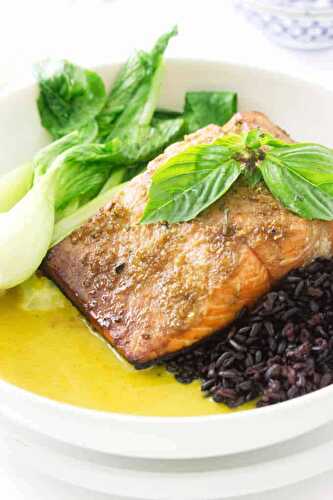 Moist fillets of Salmon with Thai Yellow Curry served with black rice and steamed boc choy in a pool of prepared Thai Yellow Curry.