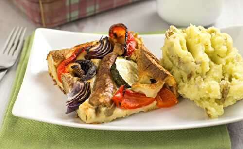 Vegetable toad in the hole - vegetarian sausages and roasted veggies, all cooked in a Yorkshire pudding batter.