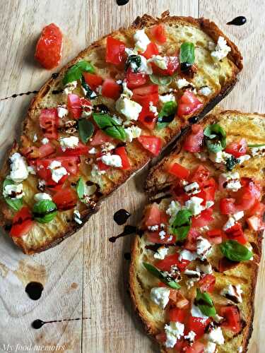 Bruschetta made with cubes of feta cheese, sweet ripe but firm tomatoes, fresh basil leaves, a drizzle of olive oil and lastly a sprinkle of black pepper.