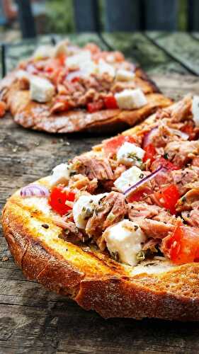 A quick and healthy bruschetta with firm beef tomatoes, yellowfin tuna steak, thin red onion slices and milky mozzarella topped with dried oregano and a drizzle of olive oil.