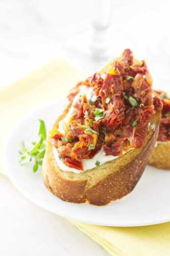 These sun dried tomato bruschetta crunchy toast appetizers are slathered with a feta cream mixture and heaped with sun dried tomatoes.