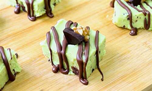 A no-bake dessert with chocolate base with a vanilla fudge topping studded with pecans and chocolate chips.