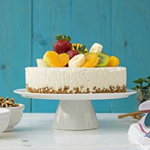 This guilt-free Greek yogurt, thyme honey and white chocolate mousse cake with a walnut and oats base and fresh fruits on top, is the perfect summer dessert!