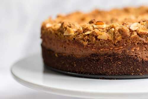 A chocolate cheesecake with a chocolate crust, a creamy chocolate filling, and a crumbly streusel topping that is perfect for any special occasion!