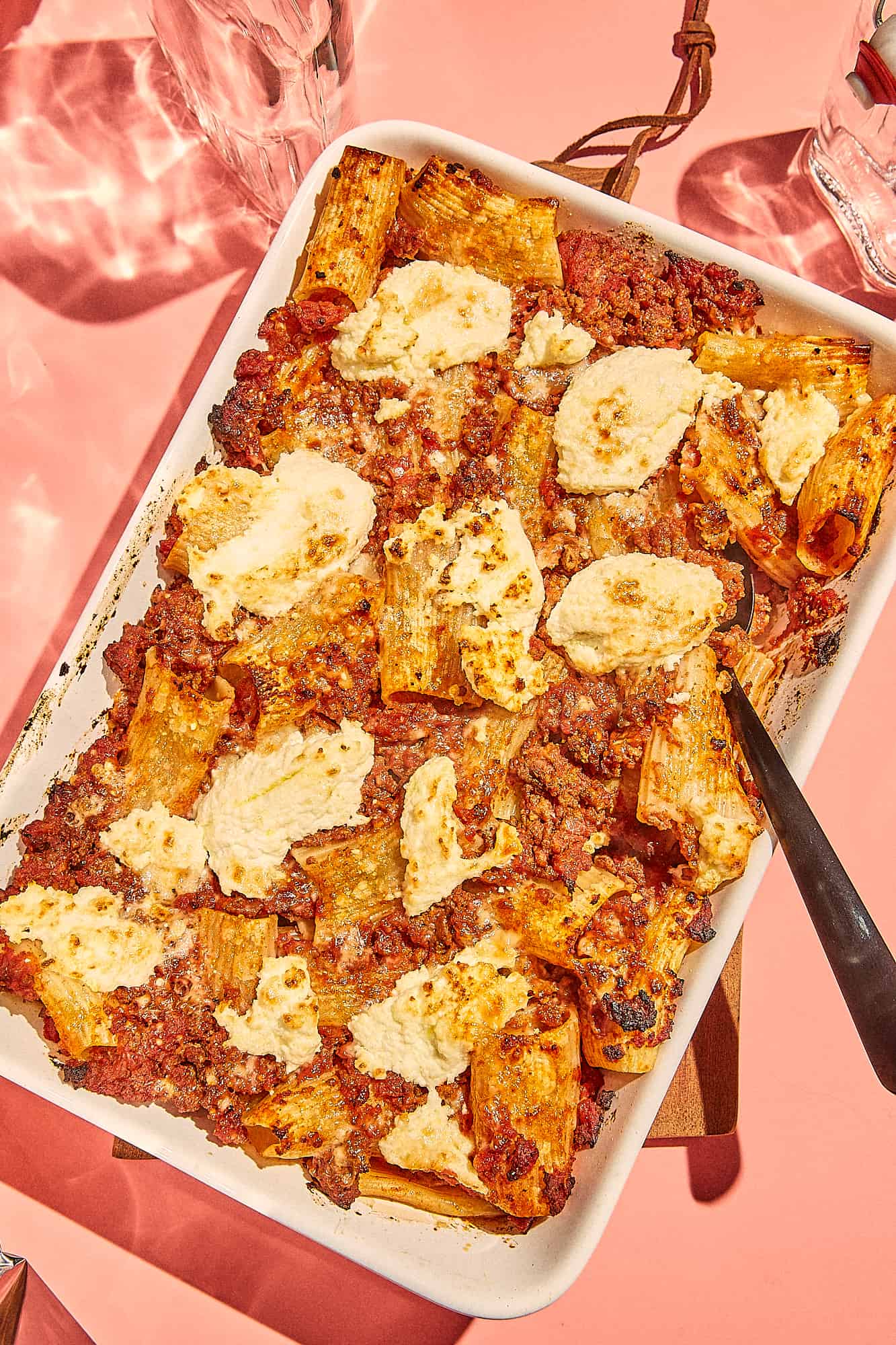 If baked ziti had a love child with lasagna, this sausage baked pasta would be it! Penne pasta is tossed in a sausage-laced tomato sauce with spinach, then is baked with dollops of creamy ricotta and mozzarella.