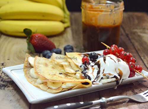Classic sweet crepes served with banana, berries, or fruits of your choice along with chilled ice cream and drizzled with hot caramel sauce.
