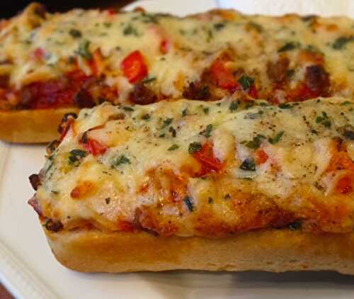 French baguette bread is topped with tomato sauce, cheese and toppings.