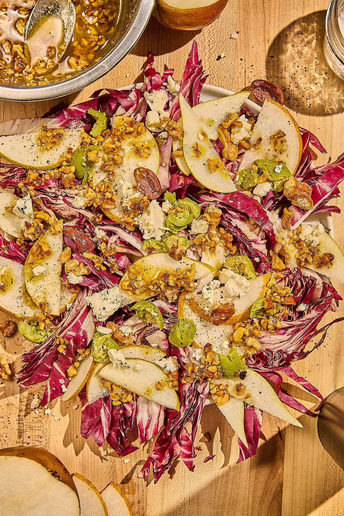 This irresistible salad features juicy pears, salty gorgonzola (or blue cheese), crunchy fennel, peppery arugula, sweet dried cherries and nutty walnuts.